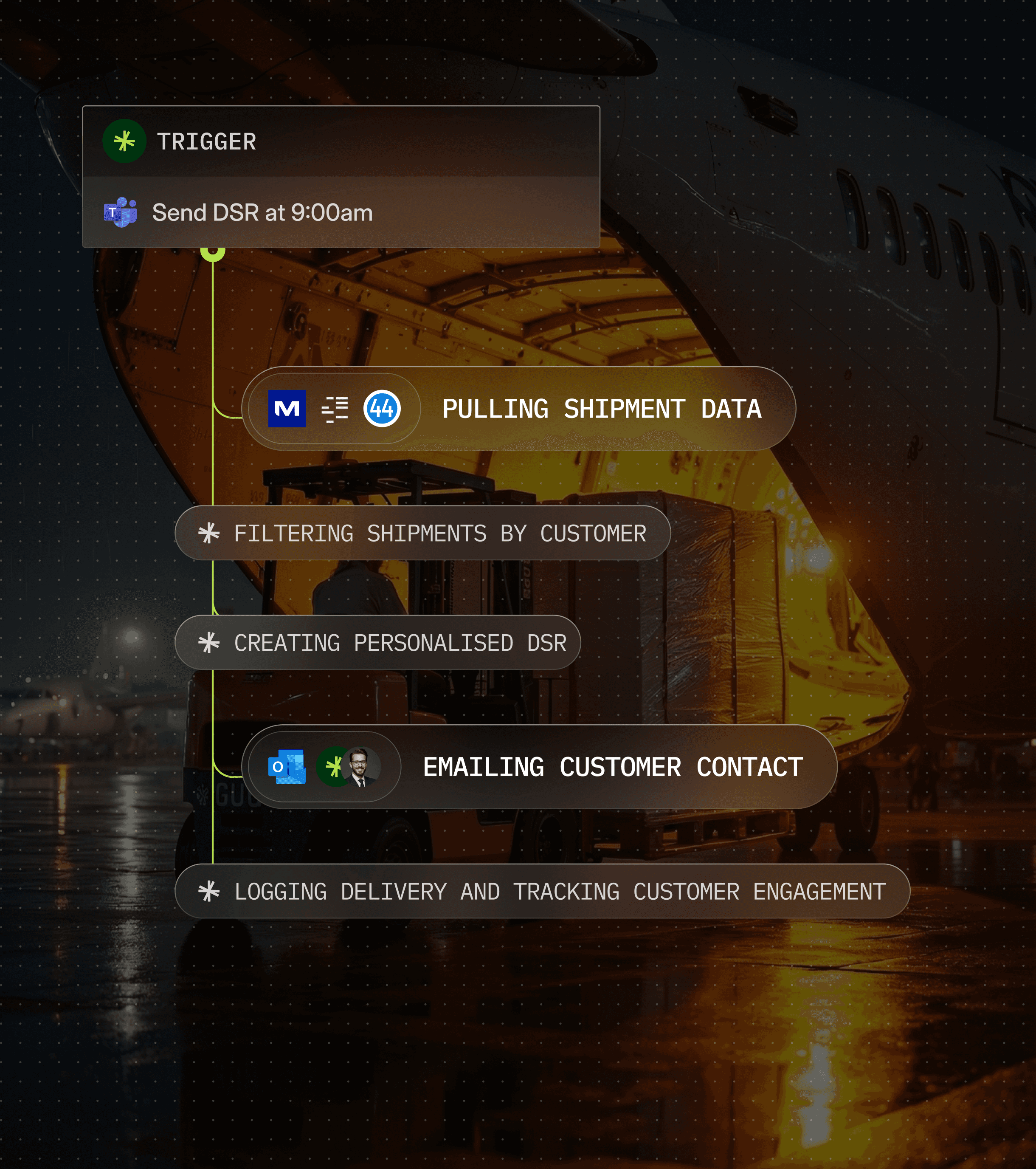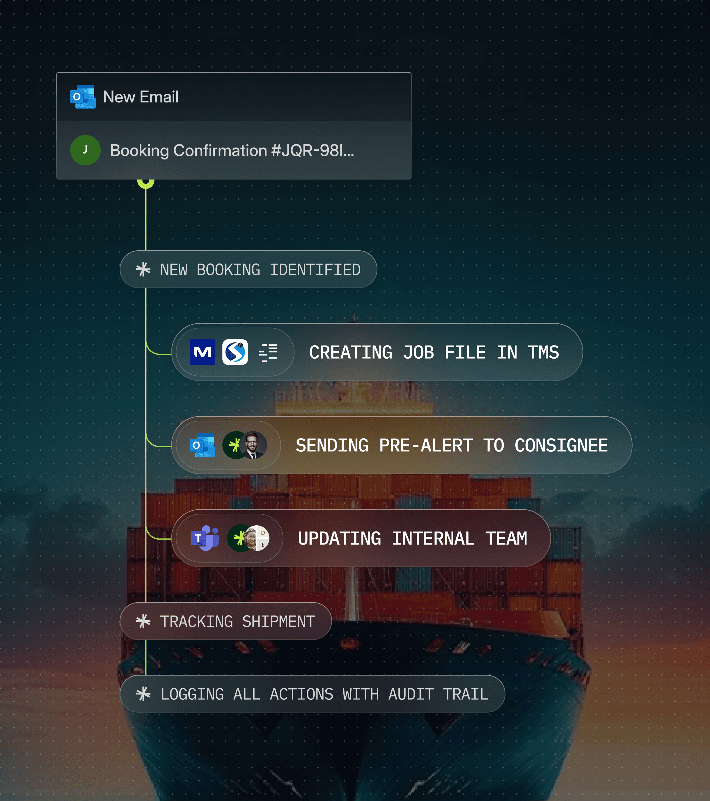 Operations teams create job files one by one, send pre-alerts manually, and reply to "where's my container?" emails all day.