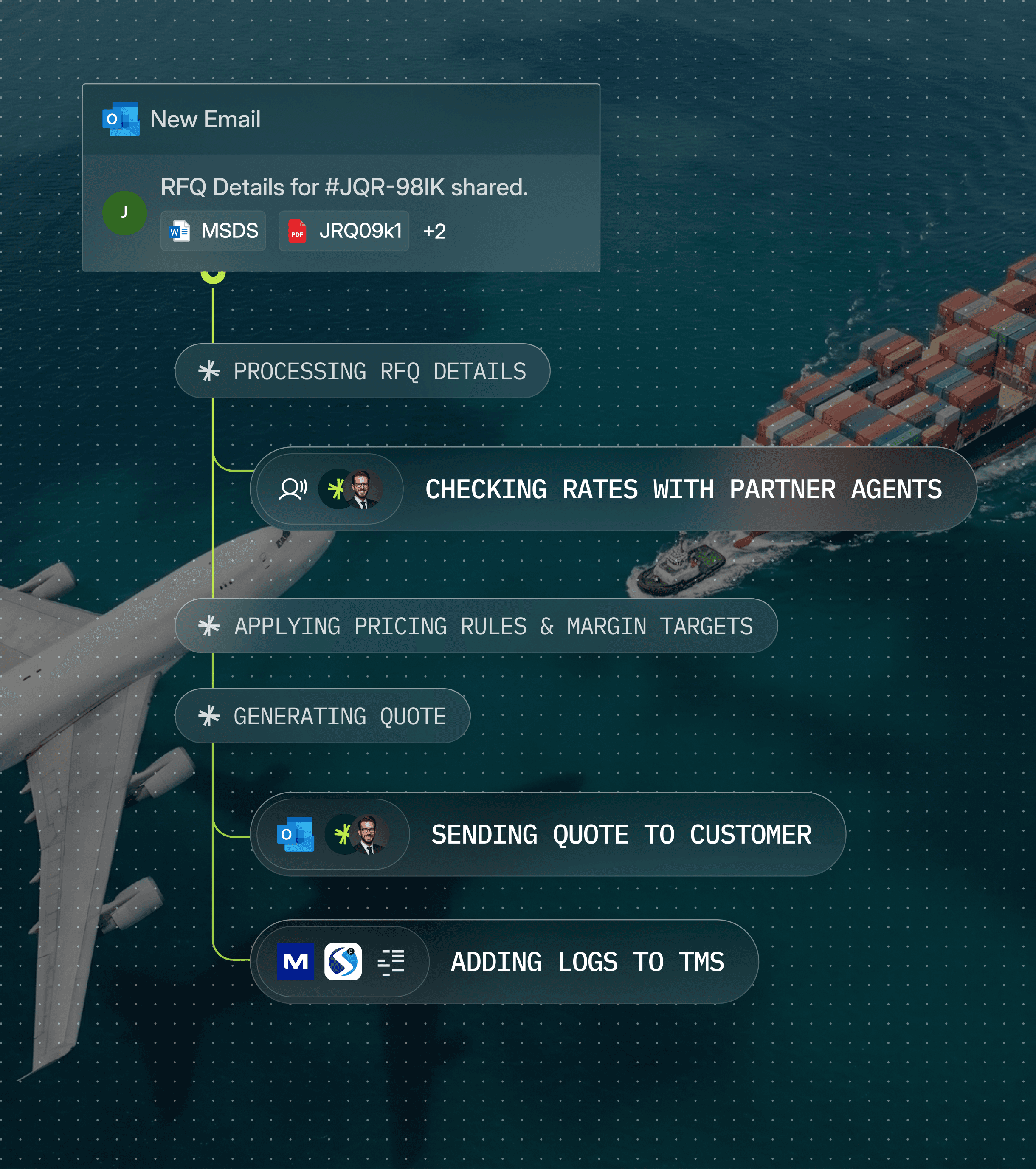 Sales teams chase RFQs across email, building quotes manually, copying rates from agents into spreadsheets.